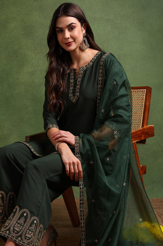 Green Silk Blend Solid Embroidered Straight Suit Set PKSKD2174
