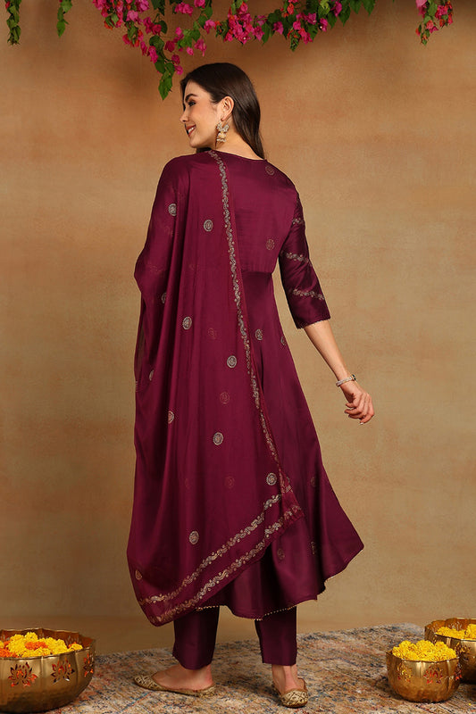 Burgundy Silk Blend Anarkali Woven Design Kurta Pant With Dupatta PKSKD1918