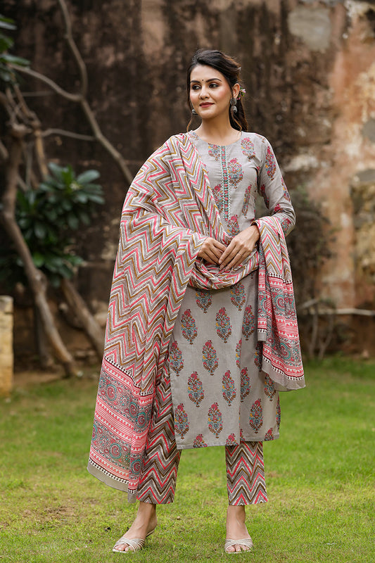 Grey Rayon Blend Straight Suit Set VKSKD1134