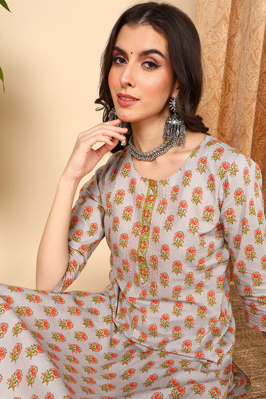 Grey Pure Cotton Ethnic Motifs Printed Straight Suit Set VKSKD2006