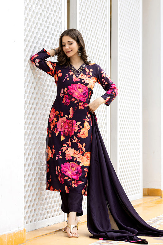 Purple Rayon Blend Floral Printed Straight Suit Set PKSKD2467
