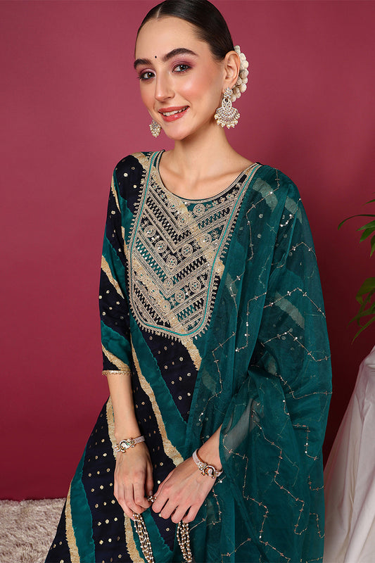 Plus Size Navy Blue Viscose Rayon Leheriya Printed Yoke Design Straight Suit Set VKSKD2099