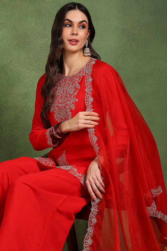 Red Silk Blend Embroidered Straight Palazzo Suit Set PKSKD2748