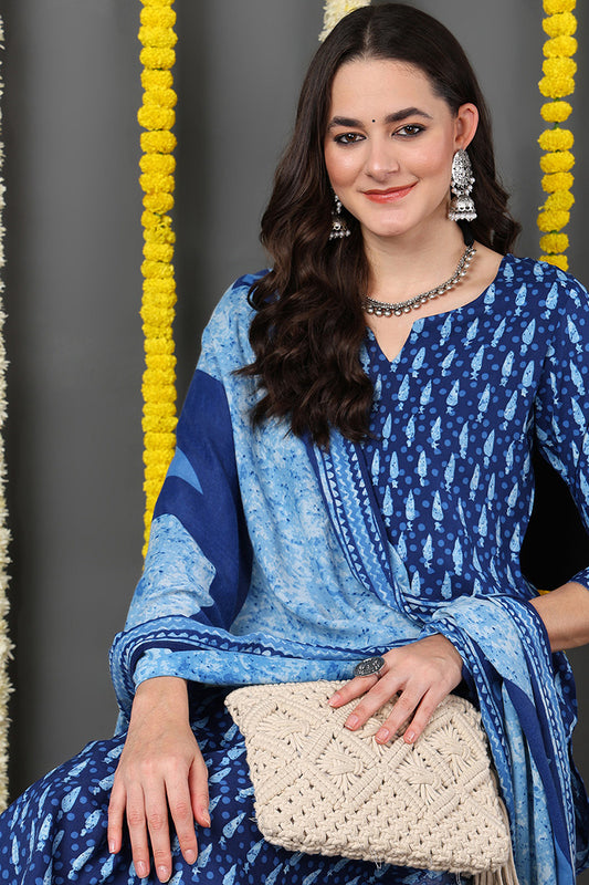 Blue Rayon Blend Printed Kurta Pant With Dupatta VKSKD1720