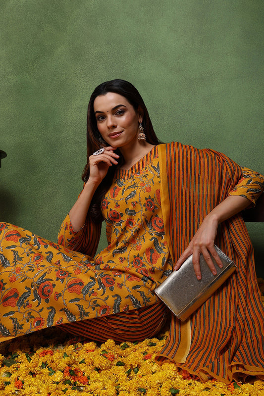 Yellow Rayon Blend Floral Printed Kurta Palazzos With Dupatta VKSKD1622