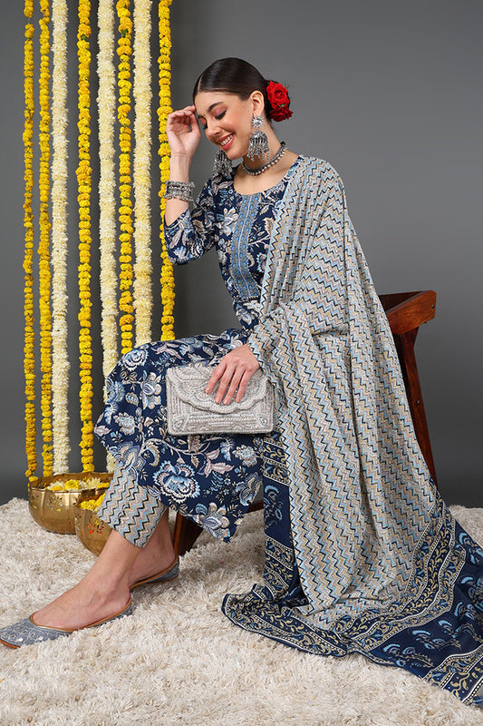 Navy Blue Rayon Blend Kurta Trousers With Dupatta VKSKD1478
