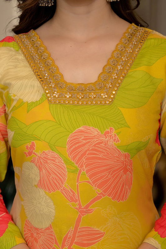 Yellow Rayon Blend Floral Printed Straight Trouser Bottom Suit Set PKSKD2425