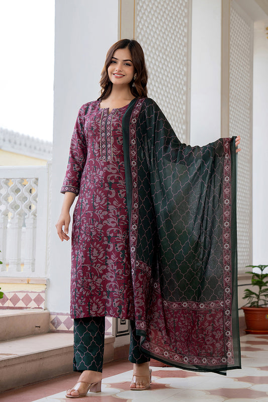 Maroon Rayon Blend Floral Printed Straight Trouser Suit Set VKSKD2266