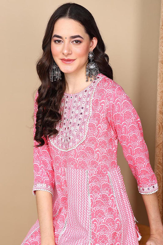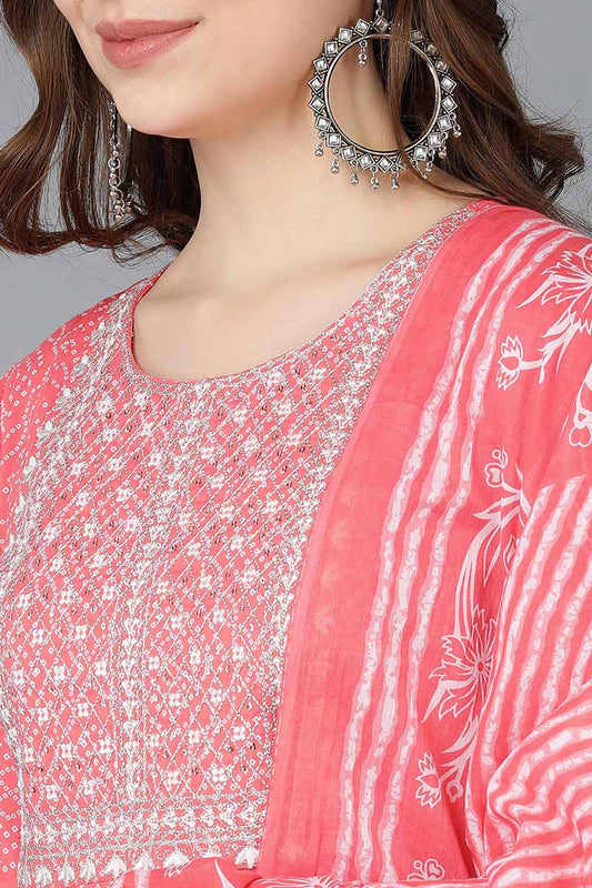 Coral Viscose Rayon Ethnic Motifs Yoke Design Flared Suit Set VKSKD2136