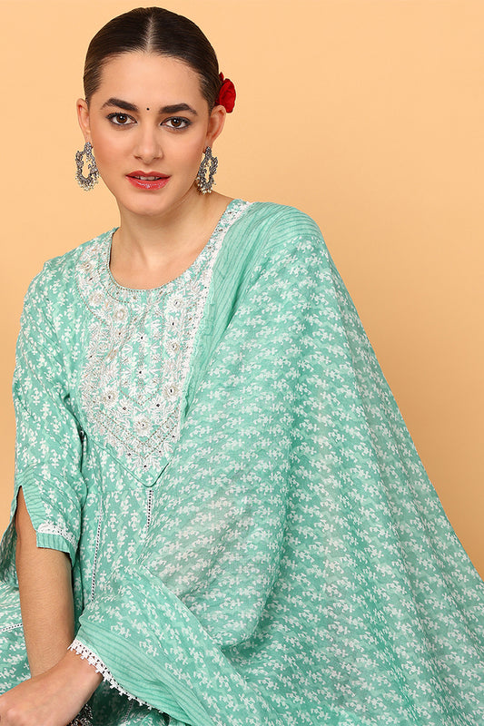 Sea Green Viscose Rayon Ethnic Motifs Printed Flared Suit Set VKSKD2140