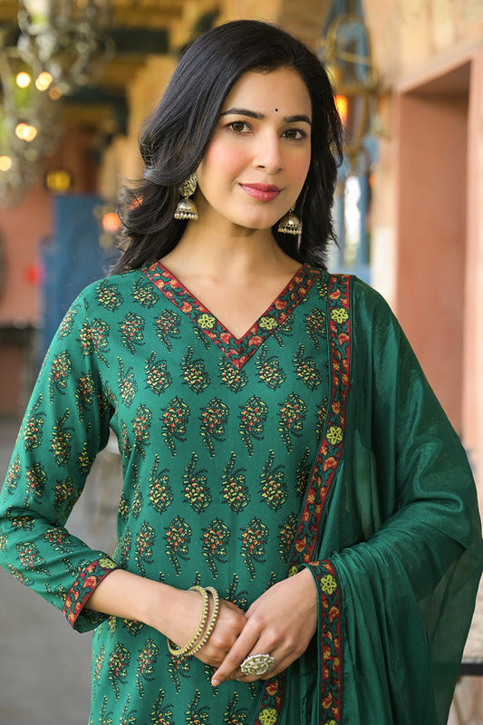 Green Viscose Rayon Floral Printed Straight Suit Set VKSKD2190
