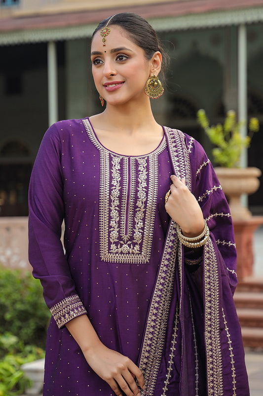 Purple Silk Blend Straight Kurta Palazzo With Dupatta PKSKD1859