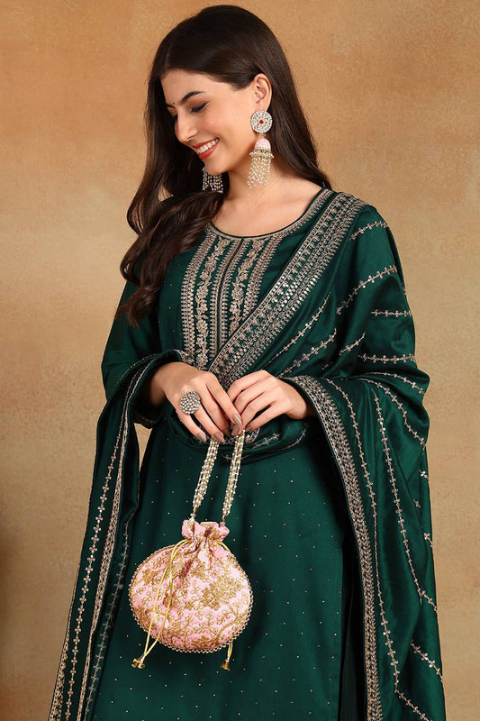 Green Silk Blend Straight Kurta Palazzo With Dupatta PKSKD1862