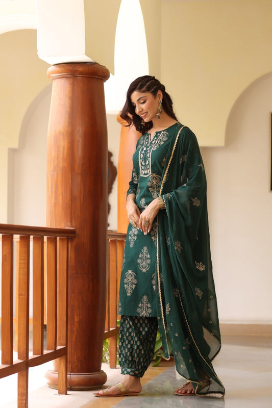 Green Gold Ethnic Print sequence Detail Cotton Kurta with Trousers Dupatta VKSKD1177