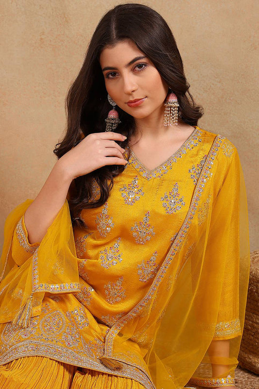 Mustard Silk Blend Straight Kurta Palazzo With Dupatta PKSKD1871