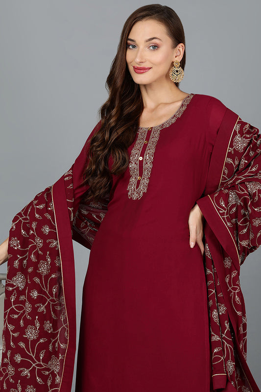 Burgundy Silk Blend Embroidered Kurta Pant With Dupatta PKSKD1783