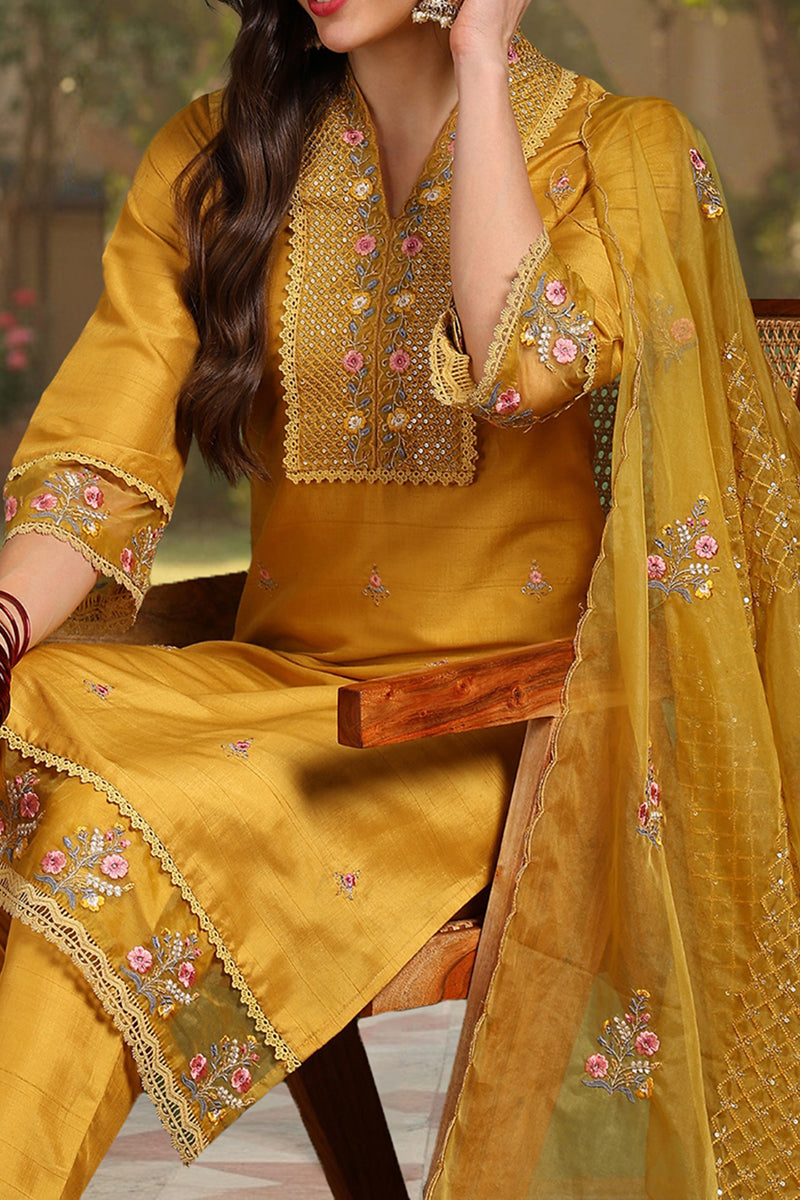 Mustard Yellow Silk Blend Floral Embroidered Straight Suit Set PKSKD2240