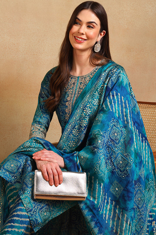 Teal Silk Blend Ethnic Motifs Printed Straight Suit Set PKSKD2200