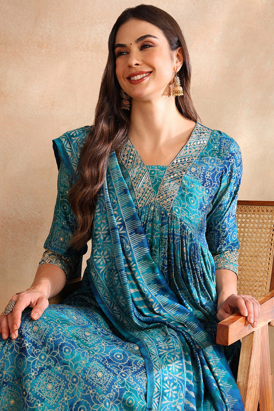 Teal Silk Blend Ethnic Motifs Printed Flared Suit Set PKSKD2205