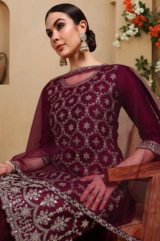 Silk Blend Purple Embroidered Straight Kurta Sharara With Dupatta PKSKD1873
