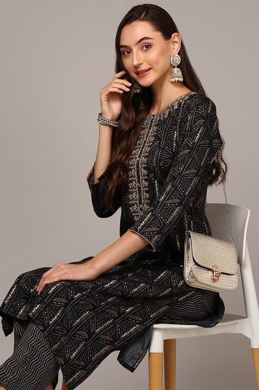 Navy Blue Silk Blend Floral Printed Straight Kurta VCK9698