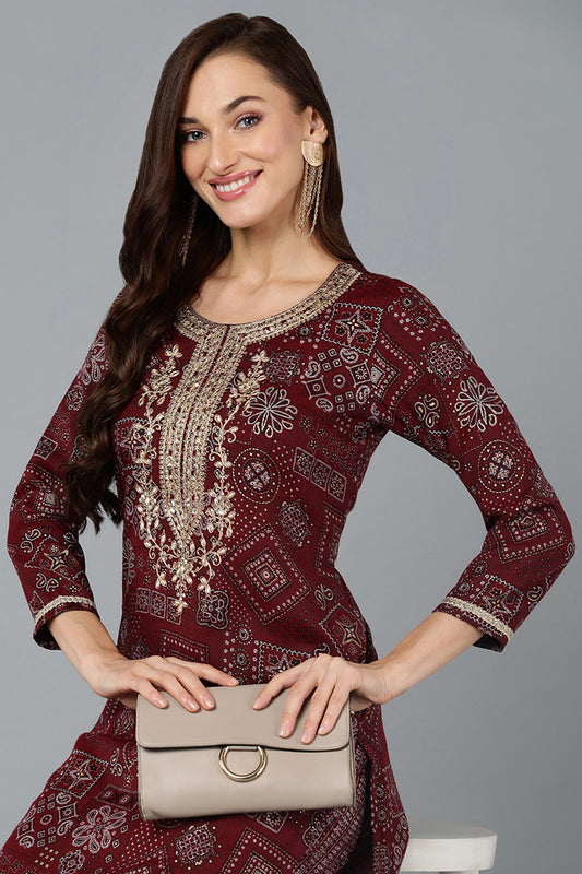 Cotton Blend Maroon Printed Straight Kurta VCK9270