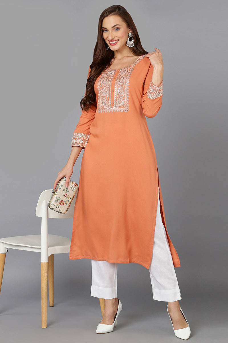 Coral Peach Viscose Rayon Embroidered Straight Kurta VCK9220