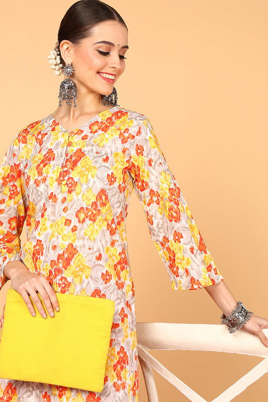 Grey & Mustard Yellow Screen Floral Printed Straight Kurta VCK1639