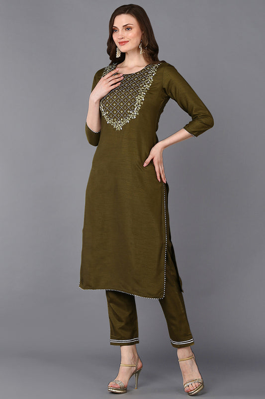 Mehndi Green Silk Blend Embroidered Straight Kurta VCK9285