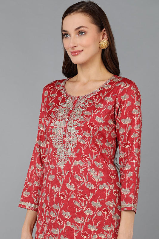 Red Silk Blend Floral Embroidered Straight Kurta VCK9075