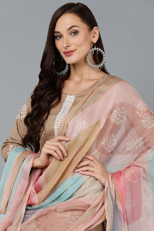 Taupe Silk Blend Straight Suit Set VKSKD1839