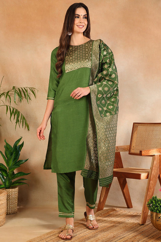 Olive Green Cotton Straight Suit Set VKSKD1802