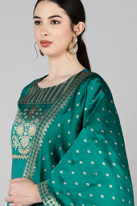 Teal Poly Silk Yoke Design Straight Suit Set PKSKD1372
