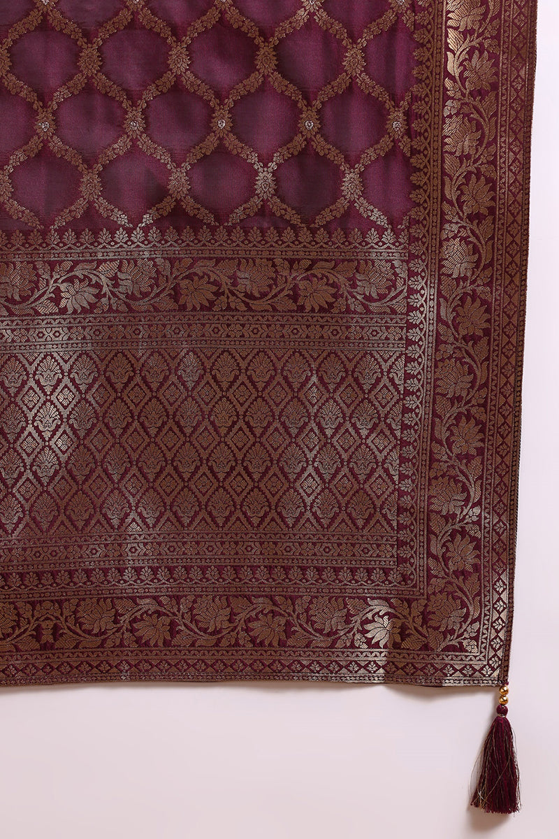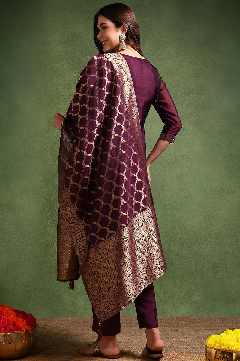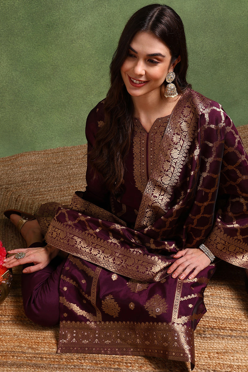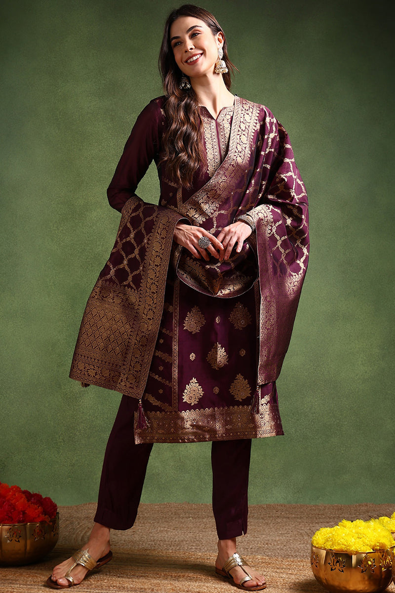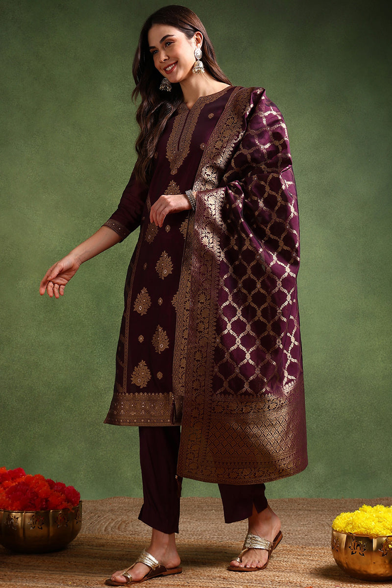 Dark Wine Chanderi Silk Woven Design Straight Trouser Suit Set PKSKD2694