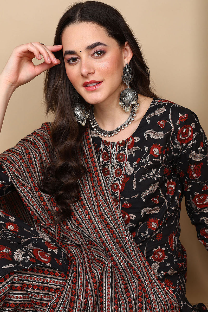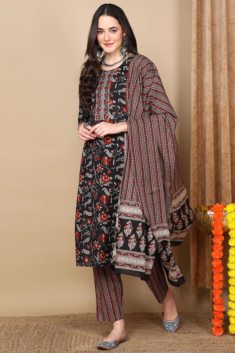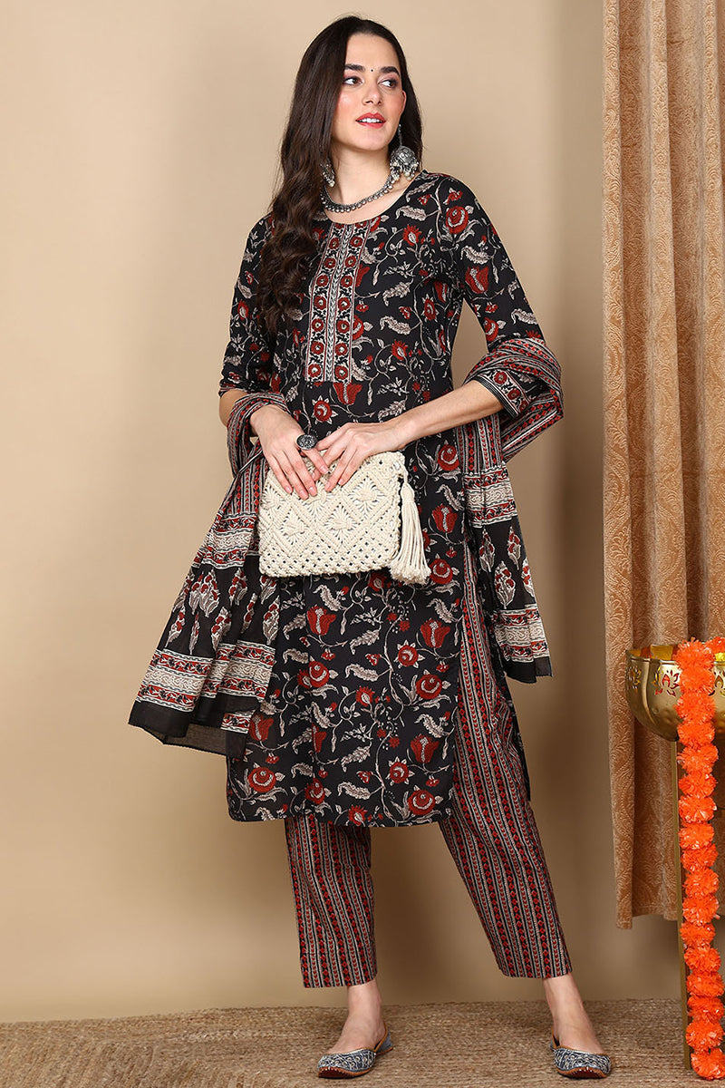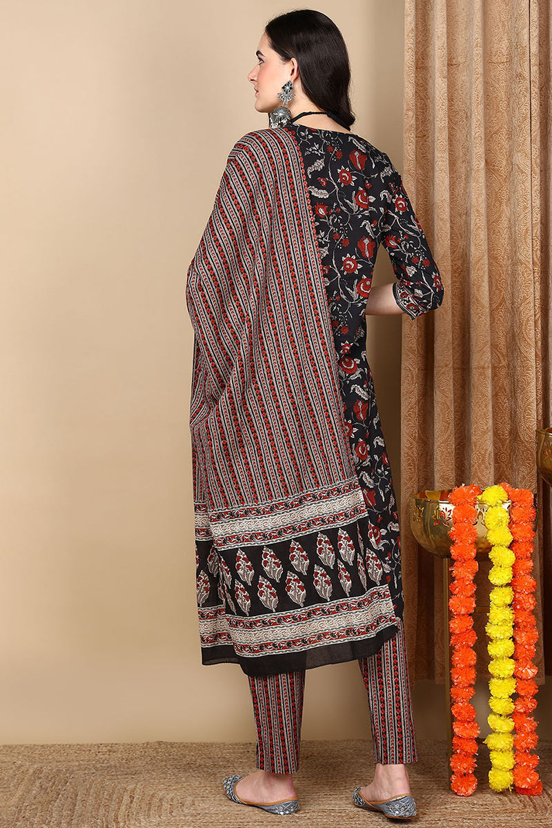 Black Rayon Blend Floral Printed Straight Trouser Bottom Suit Set VKSKD2234