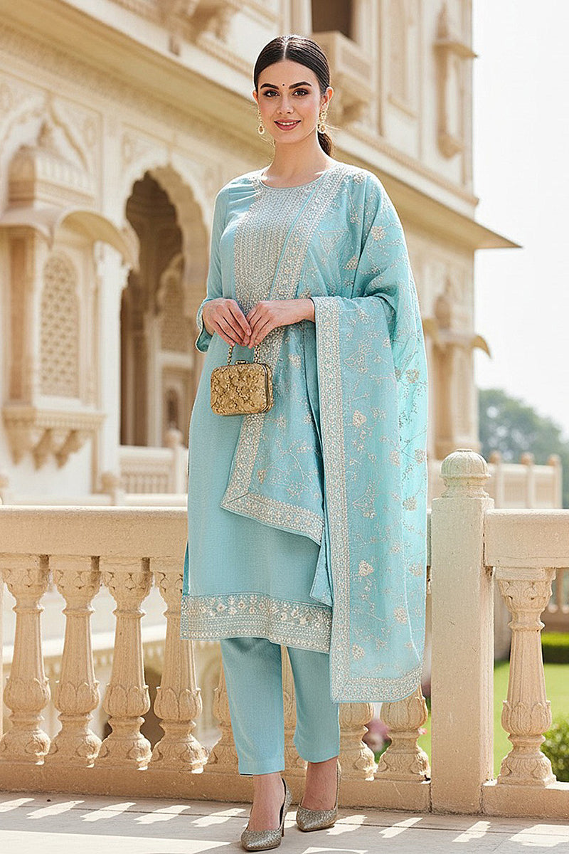 Turquoise blue embroidered Kurta with Trousers & dupatta