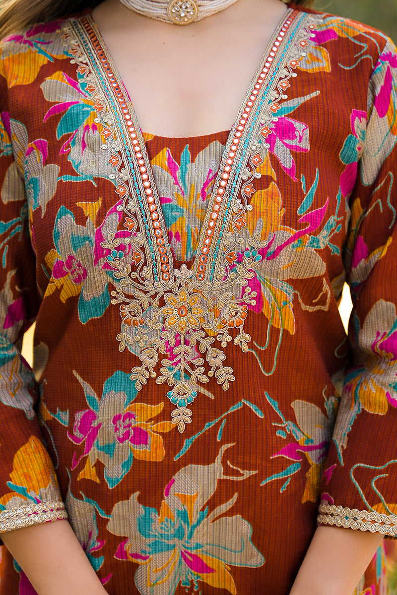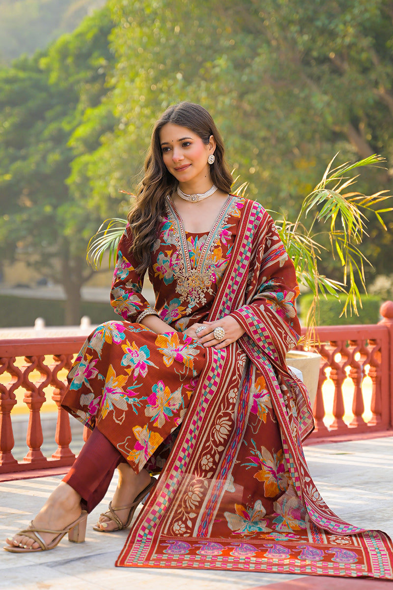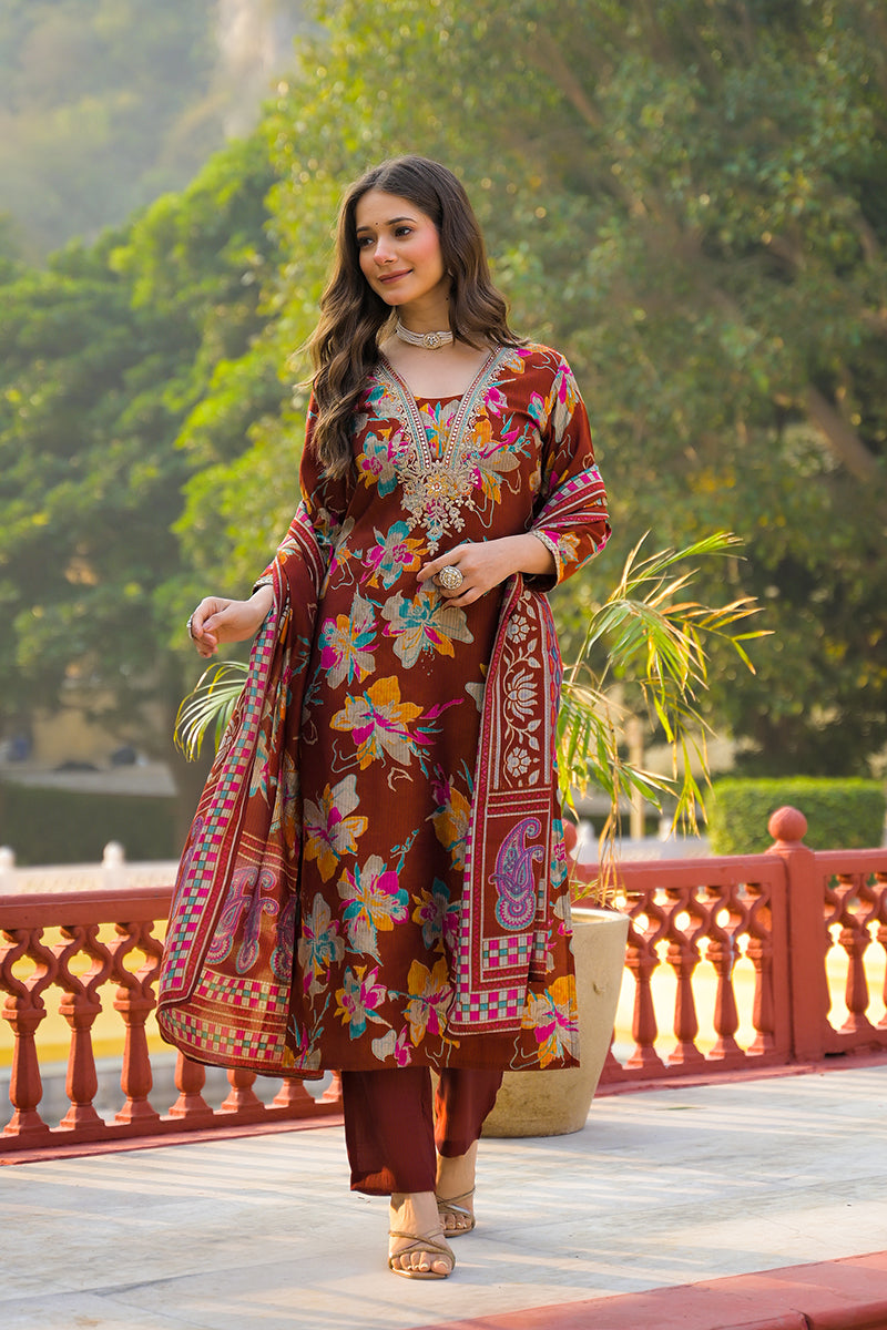 Brown Viscose Floral Printed Straight Kurta Trousers With Dupatta PKSKD3152