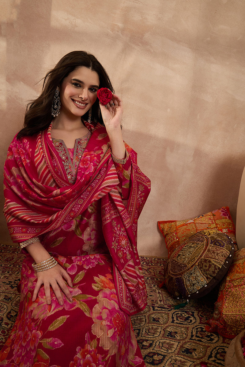 Pink Polyester Floral Printed Straight Kurta Trousers With Dupatta PKSKD3205
