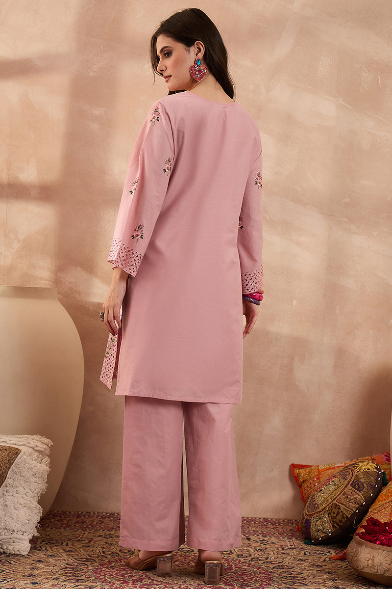 Pink Pure Cotton Embroidered Straight Coord Sets VCORD1166