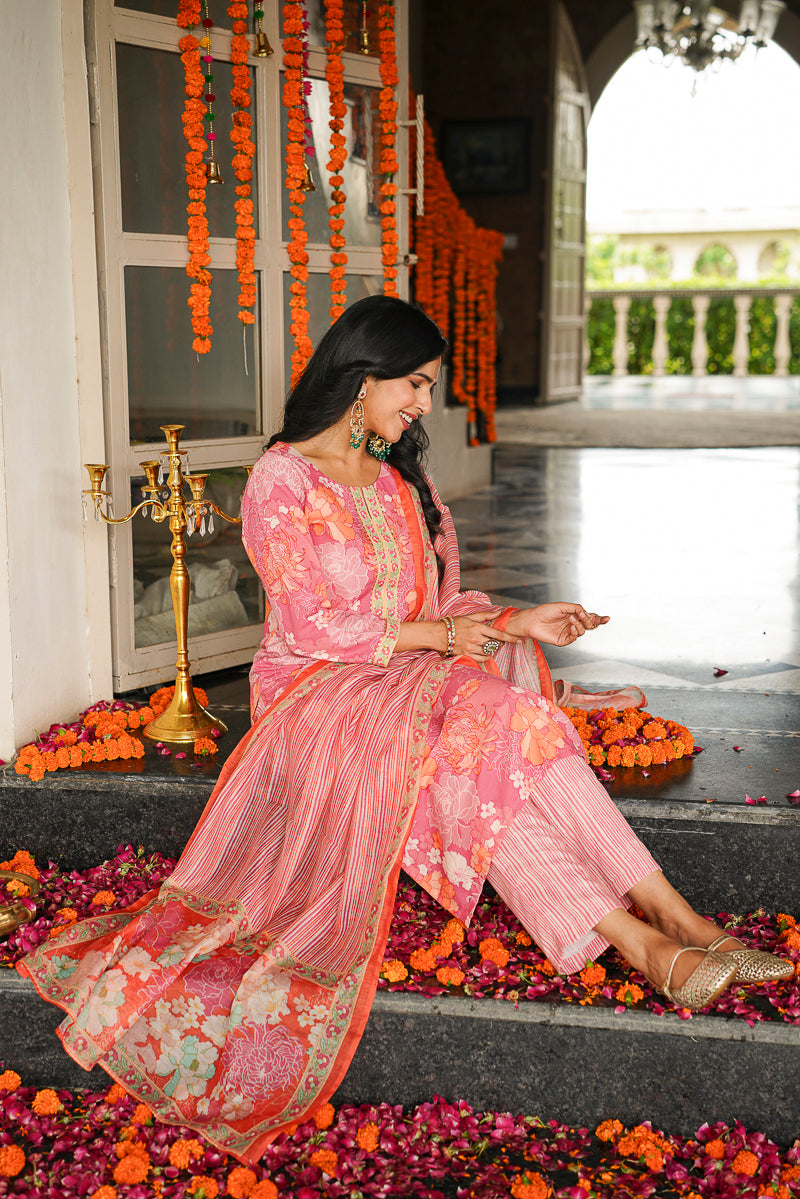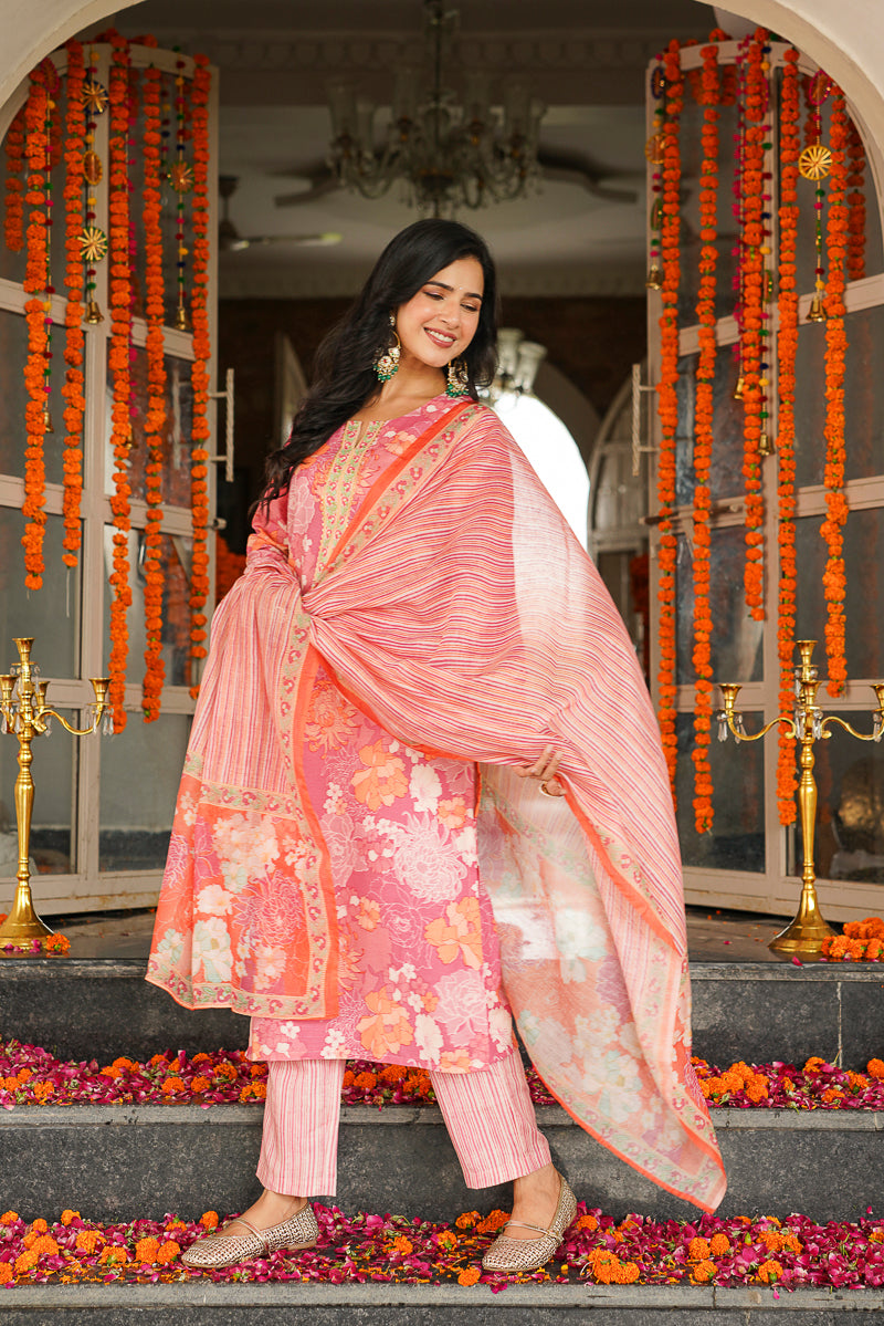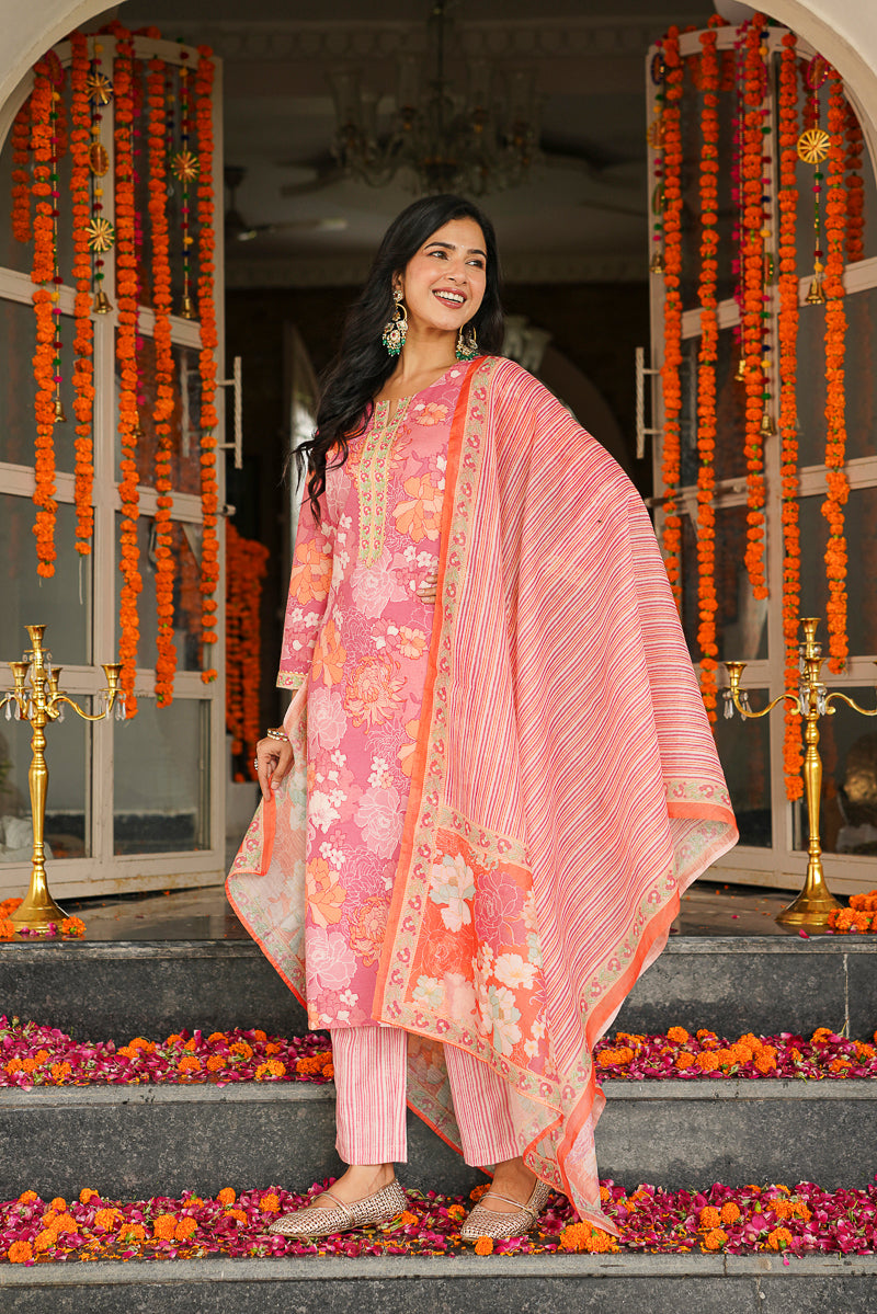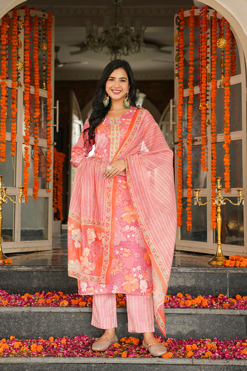 Pink Cotton Blend Floral Printed Straight Kurta Trousers With Dupatta VKSKD2405