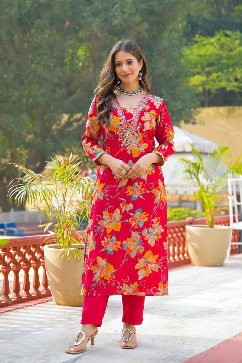 Red Viscose Floral Printed Straight Kurta Trousers With Dupatta PKSKD3159