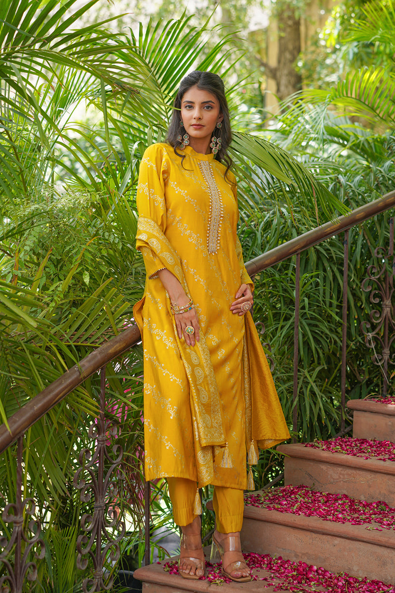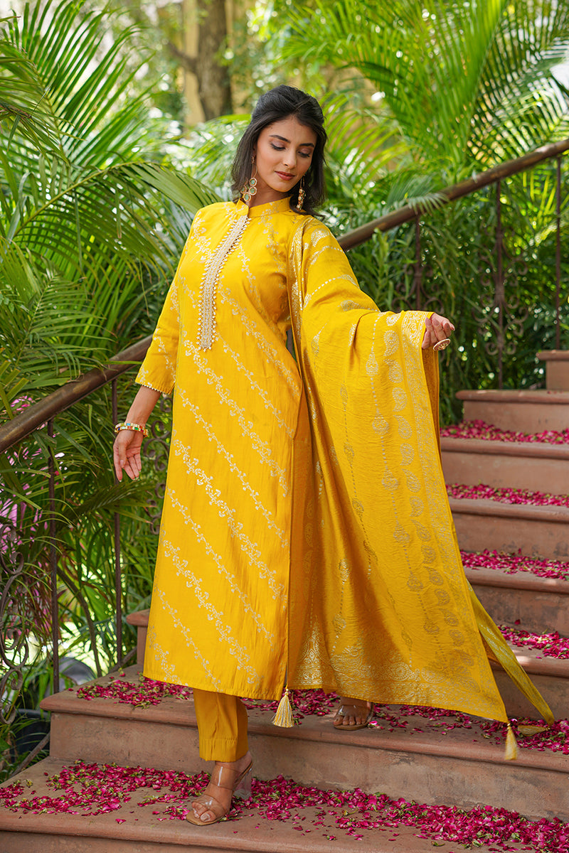 Yellow Silk Blend Floral Printed Straight Kurta Trousers With Dupatta SKSKD3043